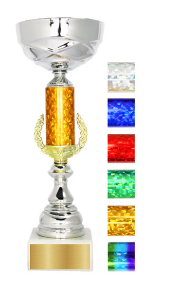 Ein moderner Pokal, der mit seinem eleganten Design und den strahlenden Farben sofort ins Auge fällt. Der silberne Kelch mit feiner Struktur wirkt edel und zeitlos, während das farbige Mittelteil in Diamant-Optik einen lebendigen und dynamischen Akzent setzt.