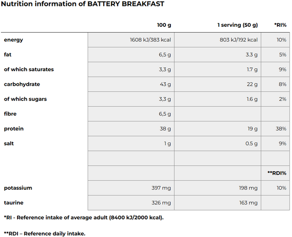 Battery Breakfast ist eine Mischung aus Molkenproteinkonzentrat und fein gemahlenem Hafer. Diese wohlschmeckende und leicht zu mischende Formel liefert 19 g Protein und 22 g Kohlenhydrate mit niedrigem GI (glykämischer Index), 3,3 g Ballaststoffe und nur 1,6 g Zucker pro 50-g-Portion.