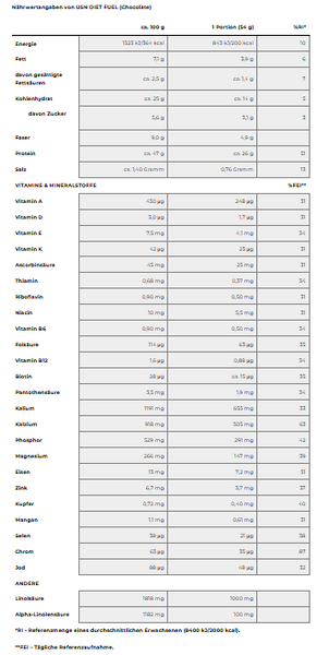 Proteinmischung [Molkenproteinkonzentrat (MILCH), SOJAPROTEINISOLAT, MILCHPROTEINISOLAT, Molkenproteinisolat (MILCH), Molkenproteinhydrolysat (MILCH)], Maltodextrin, Inulin, fettarmes Kakaopulver (Theobroma cacao), SOJAÖLPULVER (raffiniertes SOJAbohnenöl, Glukosesirup, MILCHEIWEISS, Stabilisator (Pentalatriumtriphosphat), Trennmittel (Siliciumdioxid), natürliches Aroma), Maisstärke mit hohem Amylosegehalt, Verdickungsmittel (Guarkernmehl, Cellulosegummi, Xanthan), Trikaliumcitrat, MILCH-Mineralkomplex, Aroma, Sonnenblumenölpulver (Sonnenblumenöl mit hohem Ölsäuregehalt, Glukosesirup, modifizierte Stärke: Natriumoctenylstärkesuccinat, Trennmittel: Siliciumdioxid), Natriumchlorid, Süßungsmittel (Sucralose), Emulgator (Sonnenblumenlecithin), Vitamin- und Mineralstoffmischung (Magnesiumoxid, Ascorbinsäure, Eisenfumarat, Zinkcitrat, D-alpha-Tocopherylacetat, Nicotinamid, Manganbisglycinat, Calcium-D-Pantothenat, Retinylacetat, Kupferbisglycinat, Cyanocobalamin, D-Biotin, Cholecalciferol, Pyridoxin-HCl, Riboflavin, Phyllochinon, Thiamin-HCl, Chrompicolinat, Kaliumjodat, Folsäure, Natriumselenit), Tolerase L (ph-stabile Laktase).